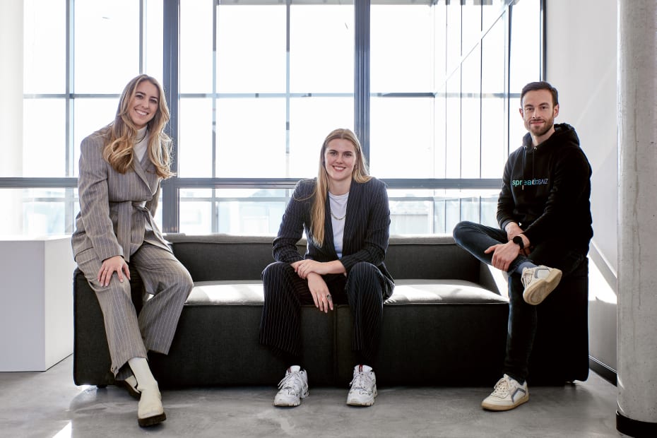 - Foto 1: SAIZ Gründerinnen Svenja Tegtmeier und Marita Sanchez de la Cerda mit Robin Nitsch, Head of Ventures and Innovation (jpg, Copyright Spread Group)